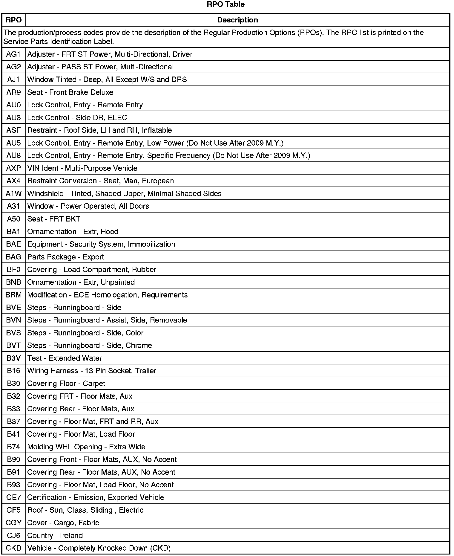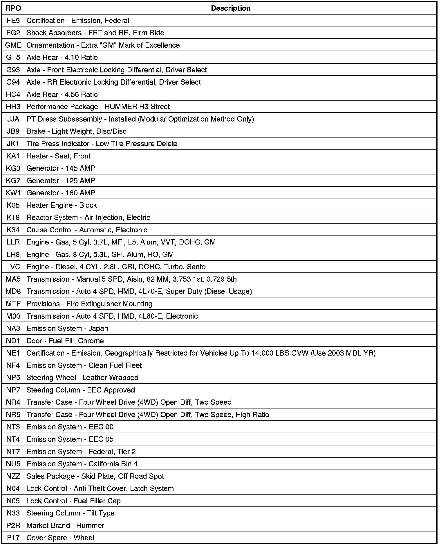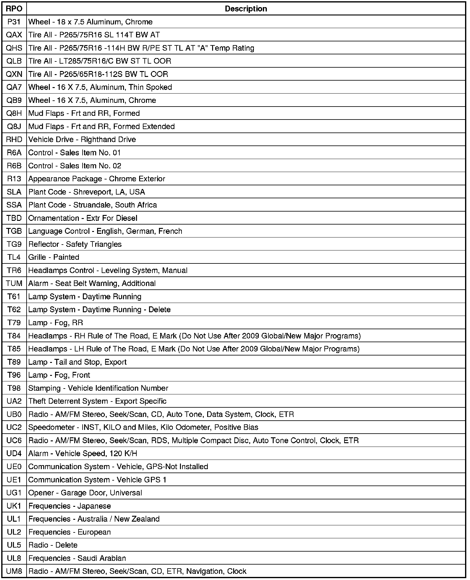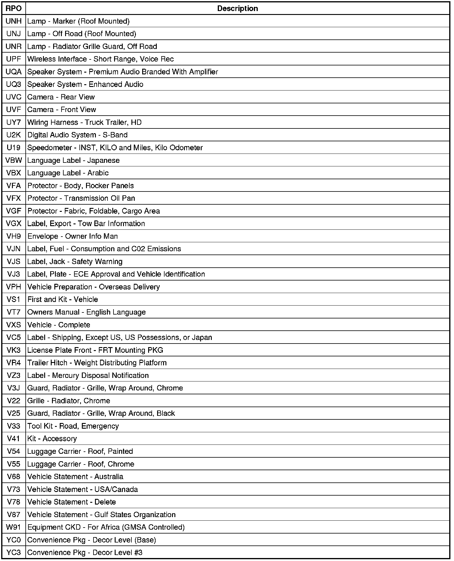 RPO Code List