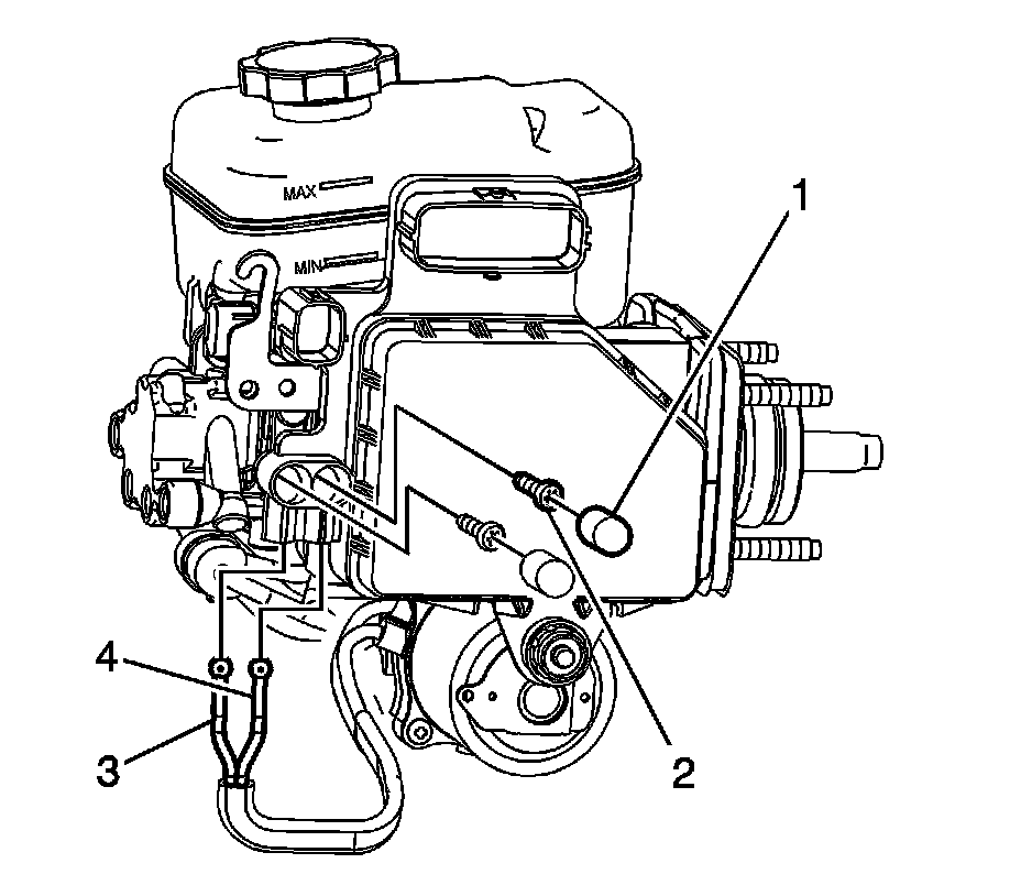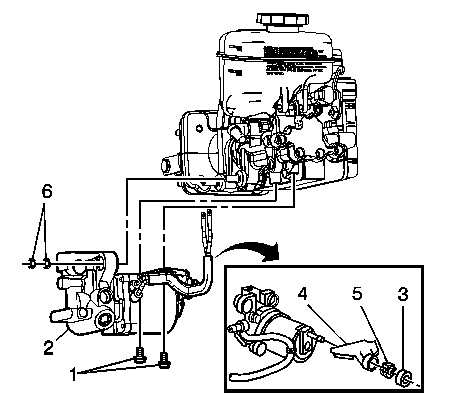 12. Remove the power brake booster pump (2) from the mounting studs on the master cylinder.