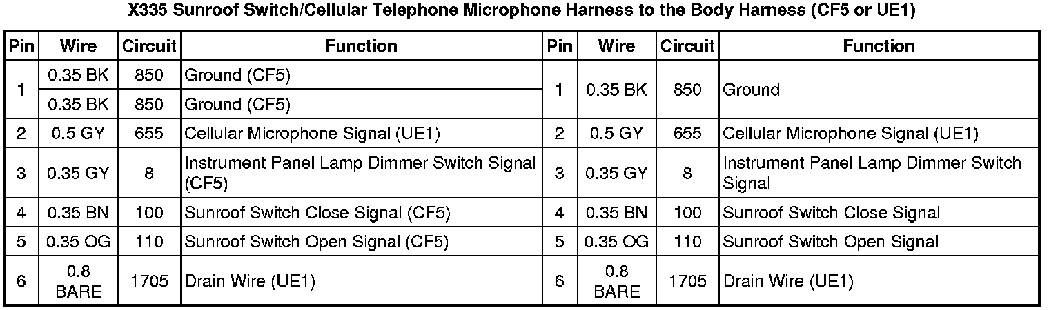 X335 Sunroof Switch/Cellular Telephone Microphone Harness to the Body Harness (CF5 or UE1)