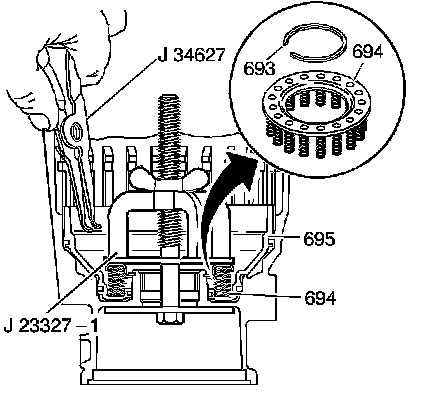 1. Using the J 23327-1 - compressor (bridge) , compress the low and reverse clutch spring assembly (694).