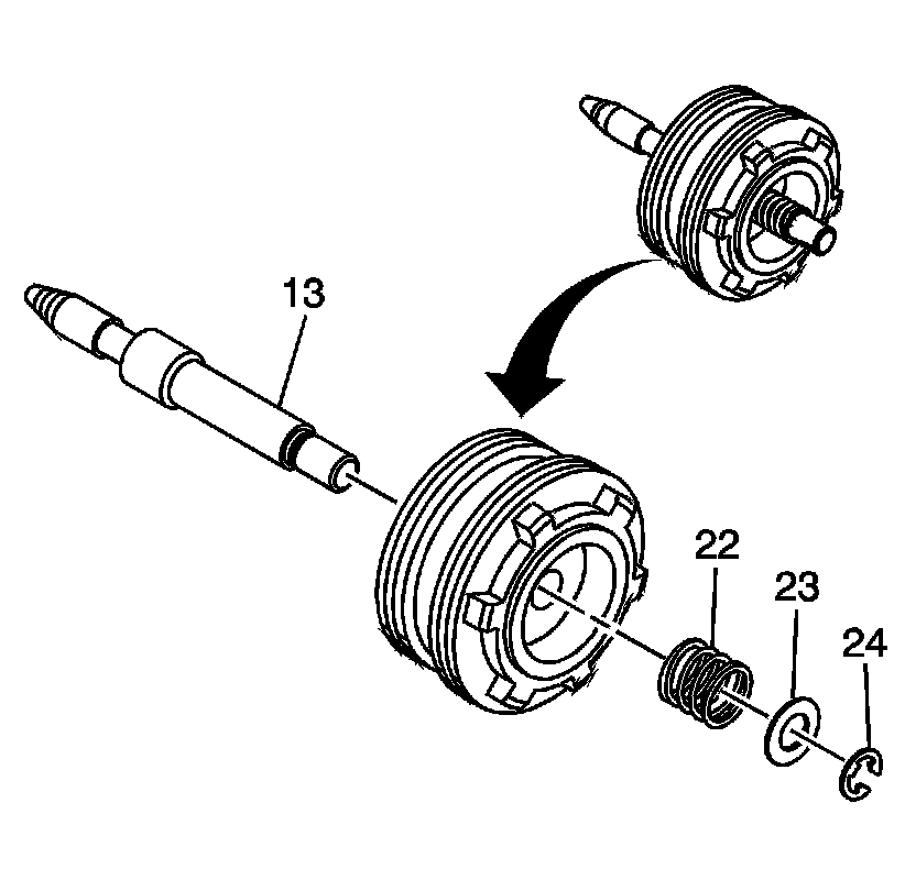 1. Disassemble the 2-4 servo assembly. Remove the apply pin retaining ring (24), the servo apply pin washer (23), the servo apply pin spring (22) and the 2nd apply piston pin (13).