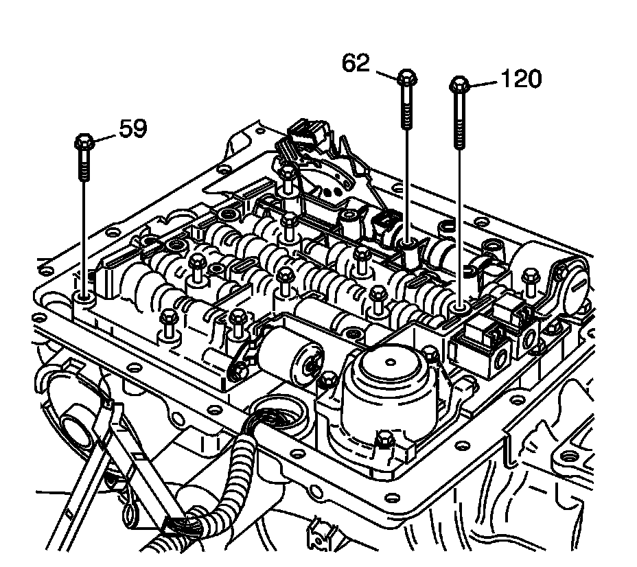 5. Install the 12 valve body bolts (62), 2 bolts (59) and 3 bolts (120) that are shown only.
