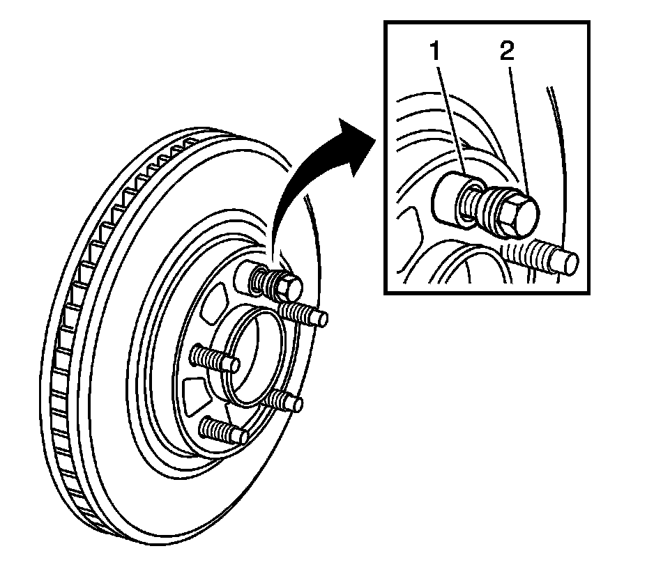 4. Hold the rotor firmly in place against the hub/axle flange and install one of the J-45101-100 - washers (1) and one lug nut (2) onto the upper-most wheel stud.