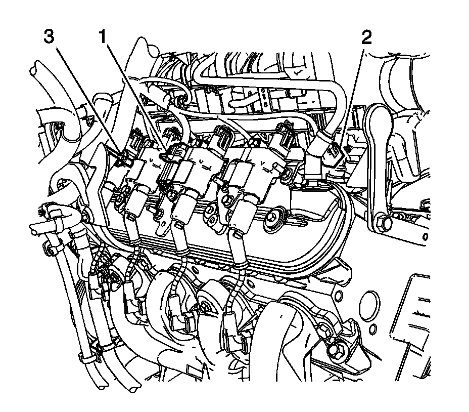 9. Remove the engine harness clip (3) from the ignition coil bracket stud.