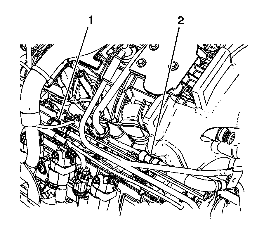 22. Disconnect the fuel feed line quick connect fitting (2) from the fuel rail. Refer to Metal Collar Quick Connect Fitting Service (Metal Collar Quick Connect Fitting Service).