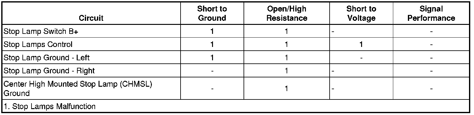 Battery voltage is supplied to the STOP lamp fuse and Stop Lamp Switch at all times. When the driver presses the brake pedal, the switch contacts close and B+ is supplied to the body control module (BCM), electronic brake control module (EBCM), powertrain control module (PCM), and the Center High Mounted Stop Lamp (CHMSL). Ground is supplied at all times to the Tail/Stop Lamp and CHMSL.