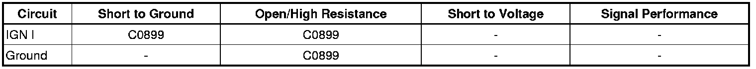 The electronic brake control module (EBCM) monitors the ignition voltage level available on the ignition 1 circuit fed by the VSES/ABS fuse 52. A low voltage condition prevents the system from operating properly. If the EBCM detects low voltage on the ignition 1 circuit, DTC C0899 will set.
