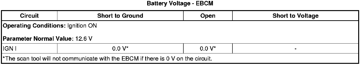 * The EBCM detects that the ignition voltage is less than 9.5 V for 10 seconds.