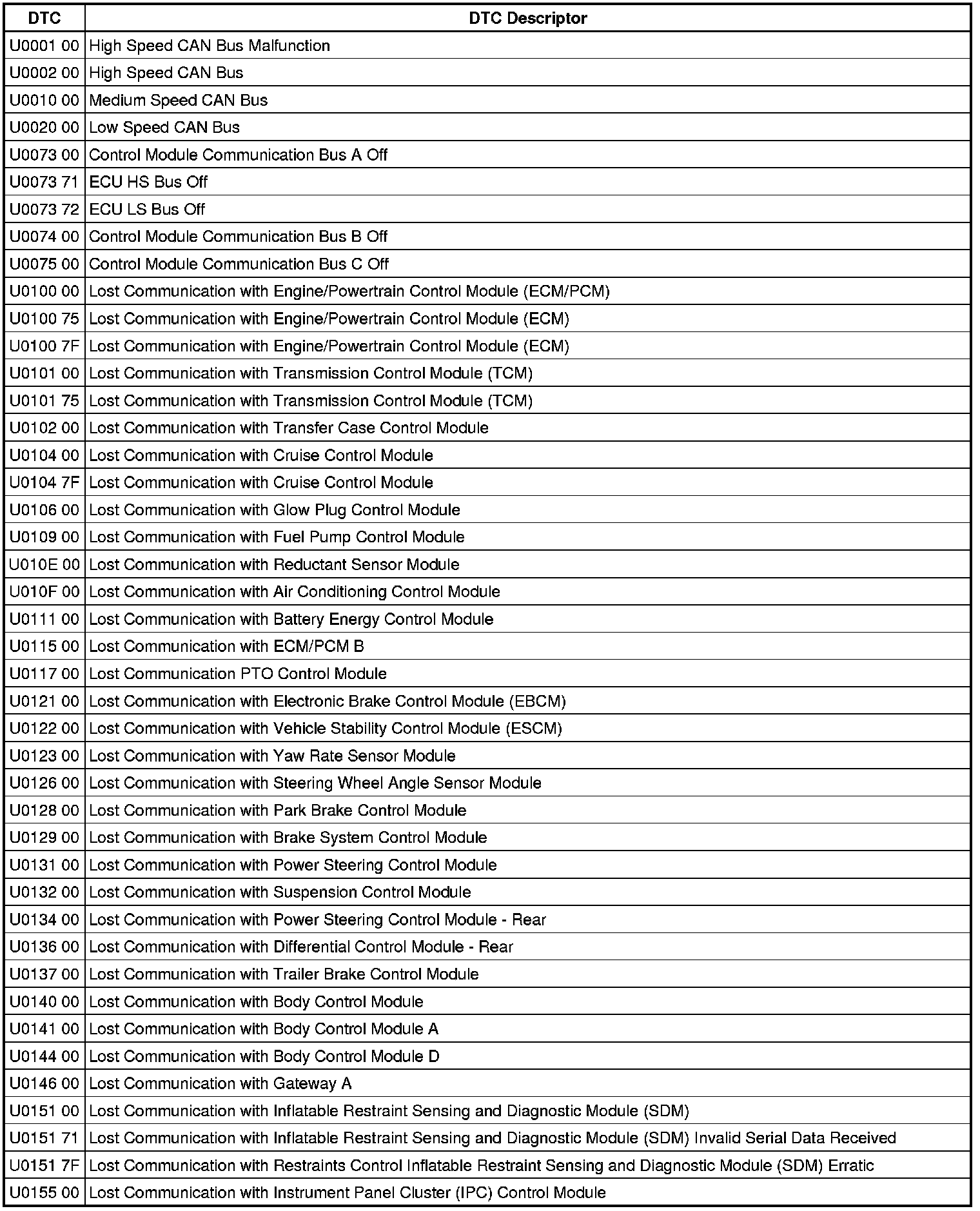 This list includes all Data Communications related U-code DTCs in alphanumeric order with descriptors for all modules. Not all DTCs listed will be applicable to all vehicles.
