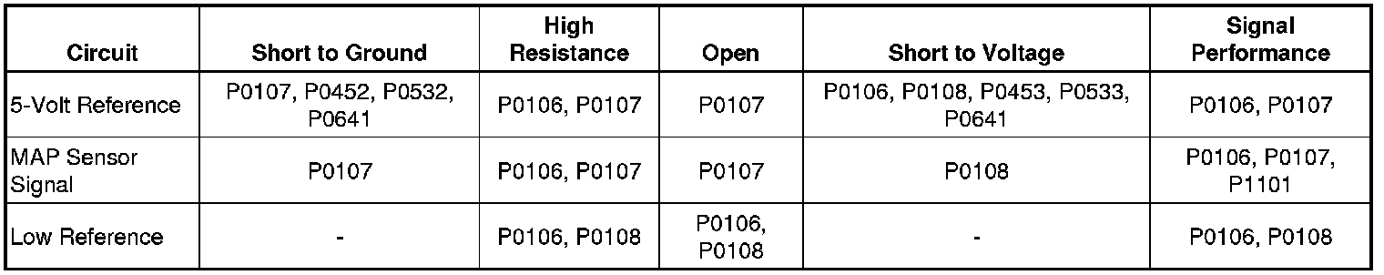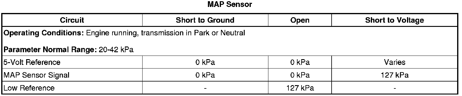 The manifold absolute pressure (MAP) sensor has a 5-volt reference circuit, a low reference circuit, and a signal circuit. The engine control module (ECM) supplies 5 volts to the MAP sensor on the 5-volt reference circuit, and provides a ground on the low reference circuit. The MAP sensor provides a voltage signal to the ECM on the signal circuit relative to the intake manifold pressure changes.