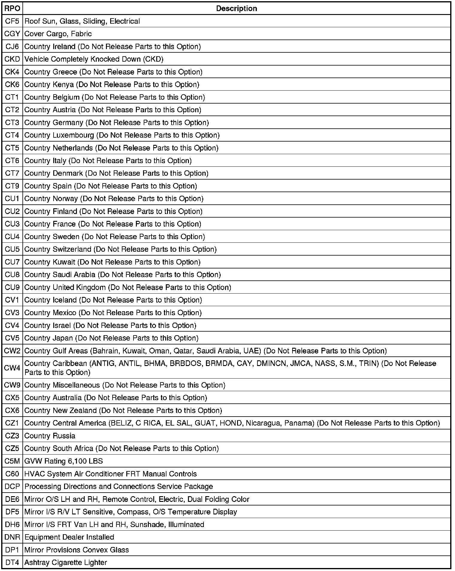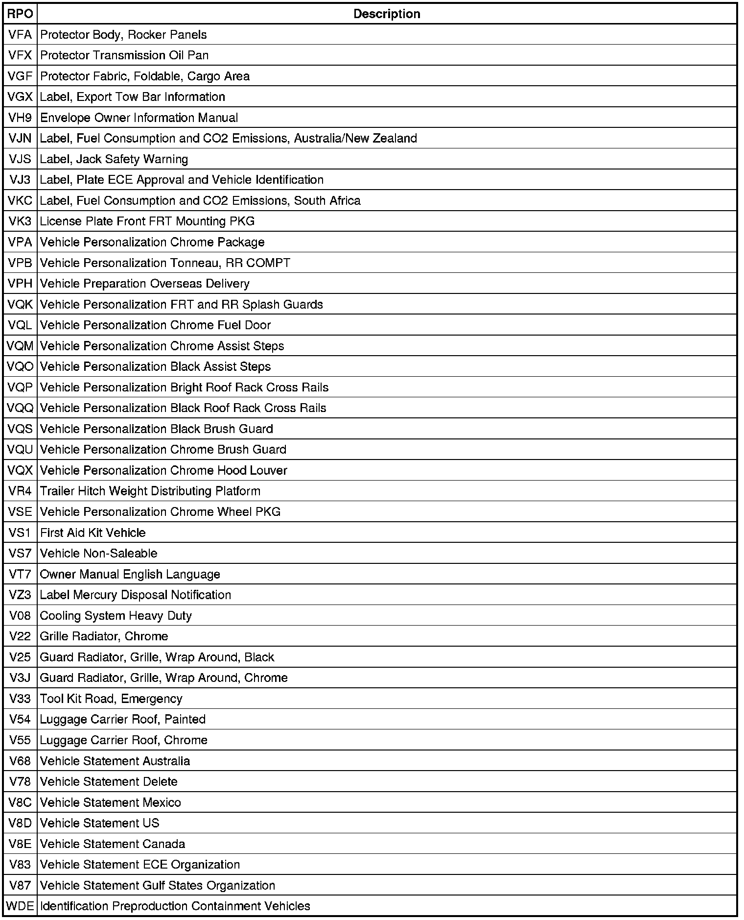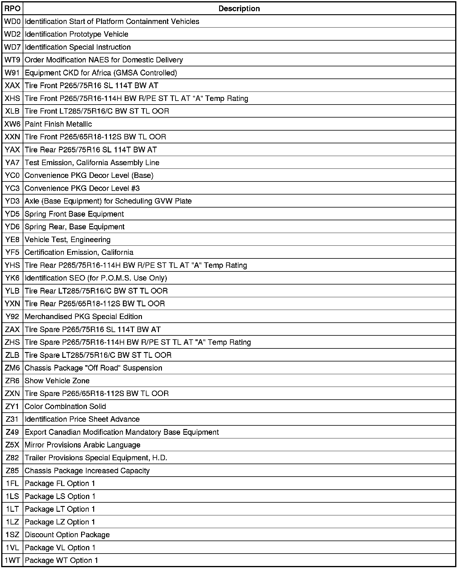 RPO Code List