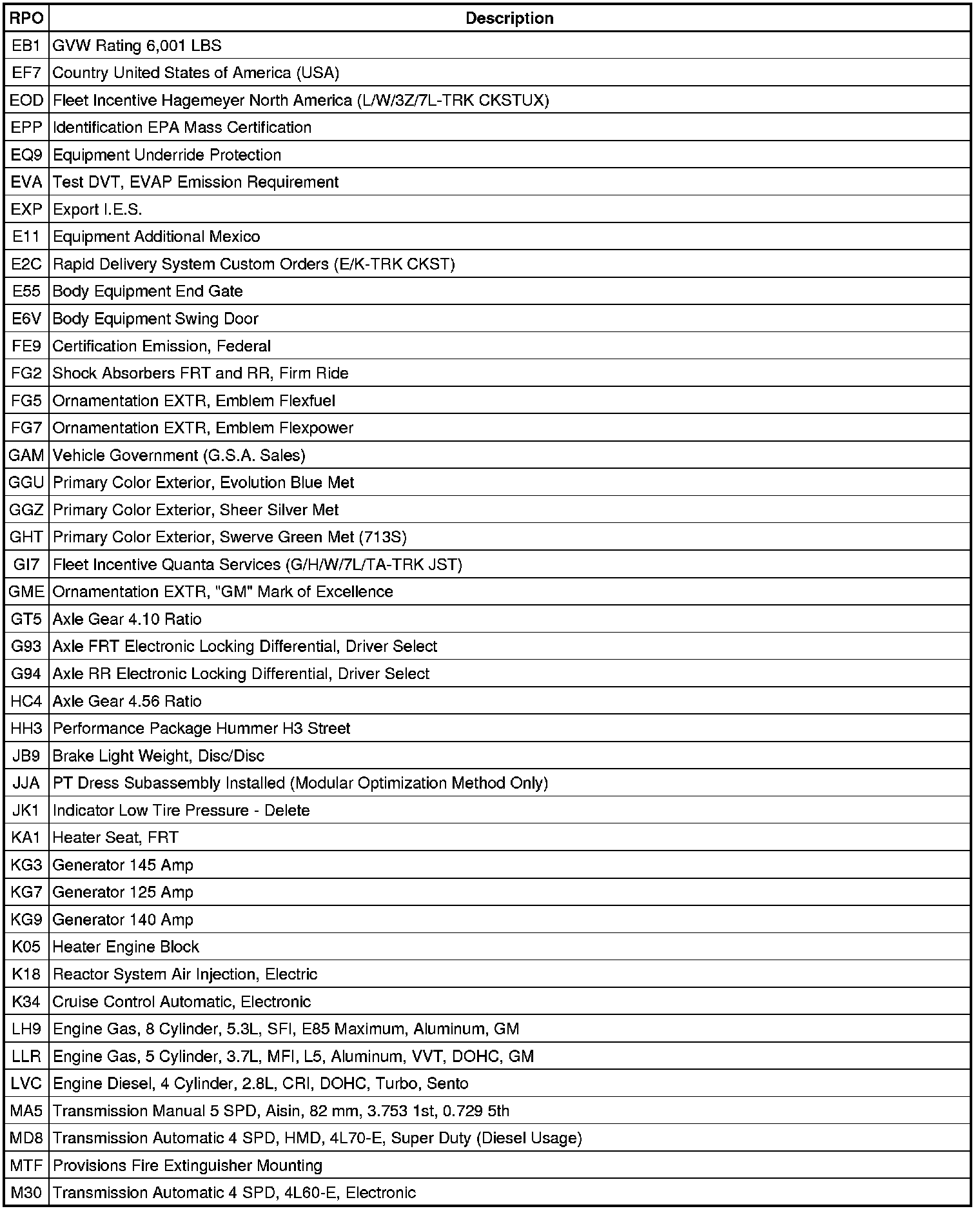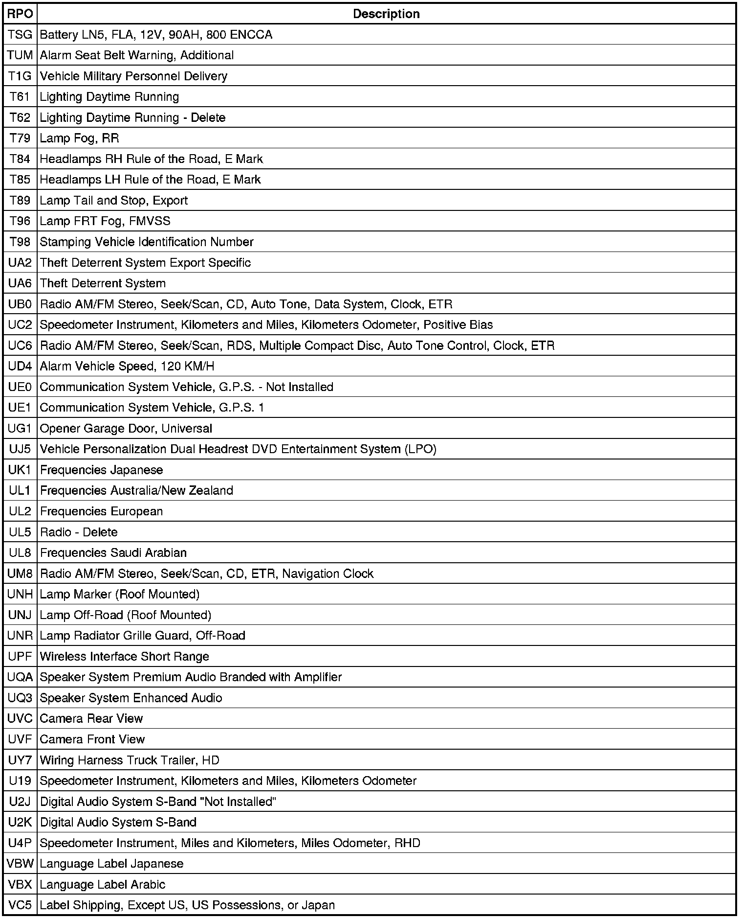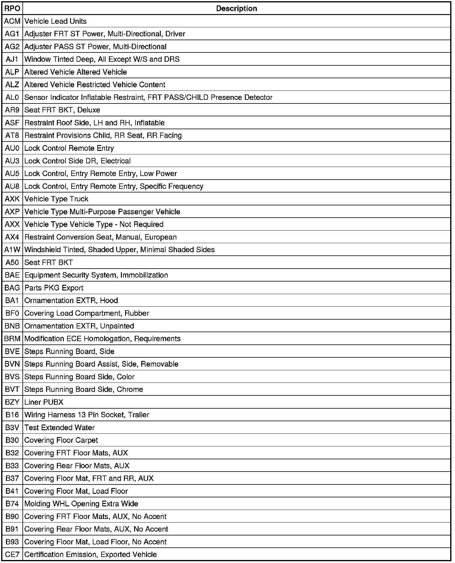 RPO Code List