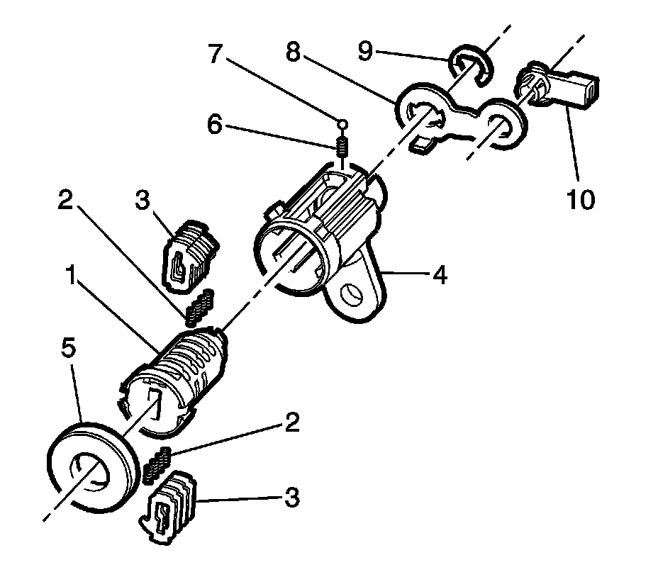 Note: The ignition lock cylinder tumblers (1) are not self retaining and must be held in place if the key is not fully inserted in the lock cylinder (2), or until the lock cylinder (2) is assembled into the case assembly (5).