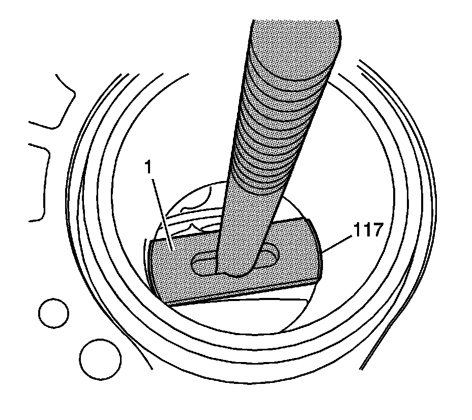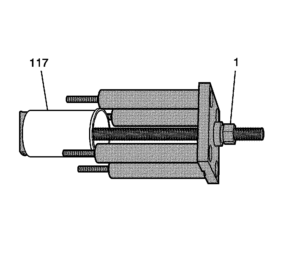 3. Align the shoe (1) of the cylinder bore sleeve puller EN 45680-452 to the bottom of the cylinder bore sleeve (117).