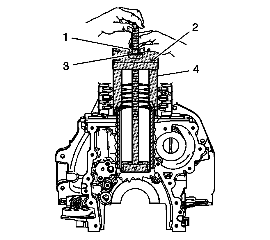 8. Install and tighten the 4 attaching bolts (2) into the cylinder head bolt holes of the block. Tighten the bolts to 15 Nm (11 lb ft).