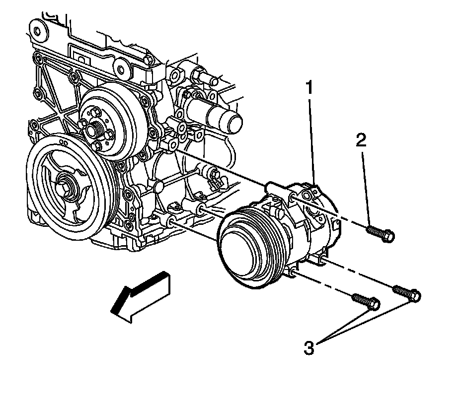 8. Install the A/C compressor mounting bolts (2, 3) and tighten to 50 Nm (37 lb ft).