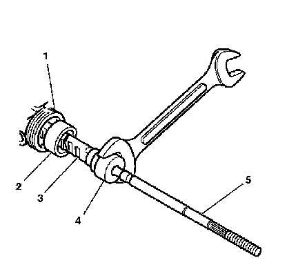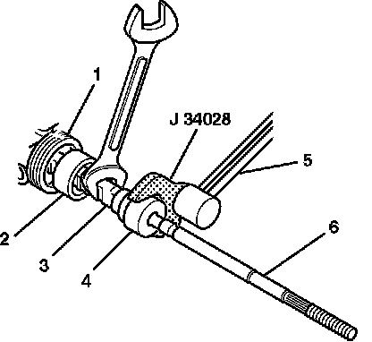 3. Position a torque wrench and the J-34028 - wrench on the inner tie rod housing (4). Use a wrench in order to hold the rack (3) while tightening the inner tie rod (5) to 88 Nm (65 lb ft).