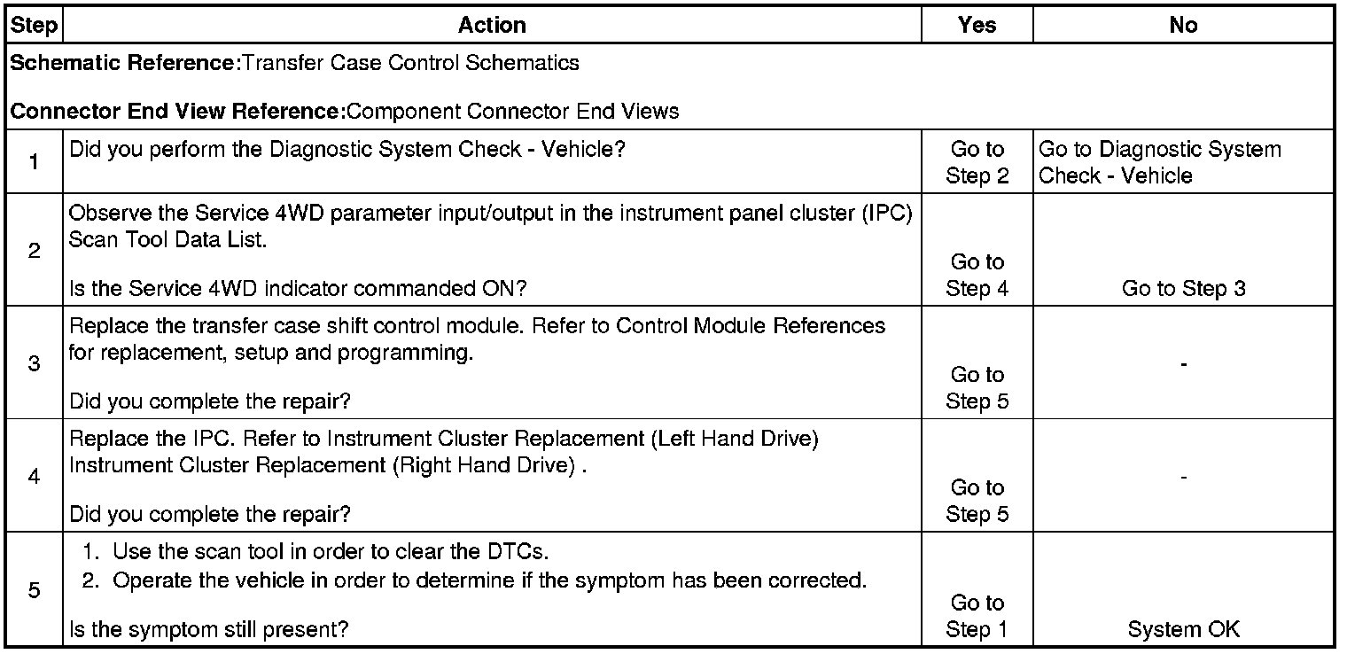 The Service 4WD indicator is located in the instrument panel cluster (IPC), and shares the common power and ground of the IPC. The transfer case shift control module controls the Service indicator lamp by sending the IPC a Class 2 message. This lamp may be controlled with the scan tool using the IPC device controls.