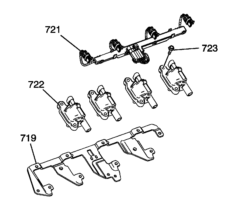 6. Install the ignition coils (722), wire harness (721), and bolts (723) to the bracket (719). Tighten the ignition coil bolts to 10 Nm (89 lb in).