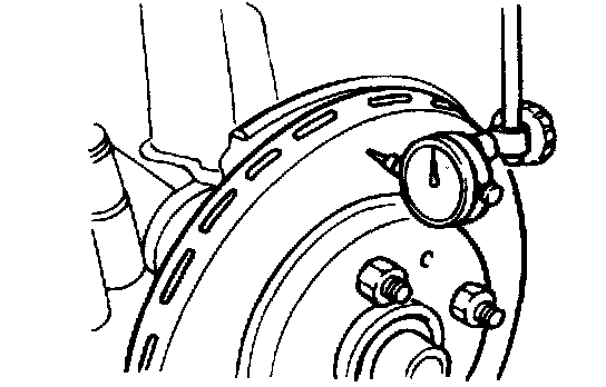 2. Place a dial gauge about 5 mm (0.2 inch) from the outer circumference of the brake disc, and measure the runout of the disc.