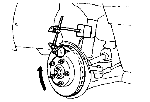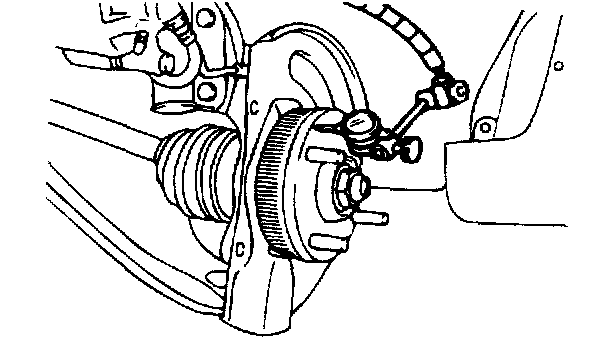 2. Remove the brake disc, and then place a dial gauge as shown in the illustration; then move the hub in the axial direction and measure the run out.
