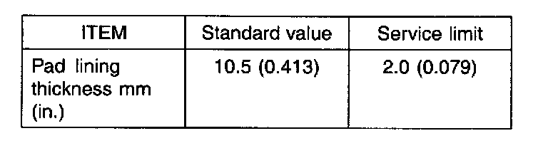 1. If the pad lining thickness is out of specification, left and right pads must be replaced as a complete set