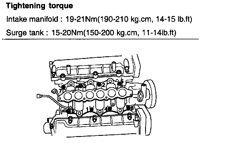 Intake manifold: 19 - 21 Nm (190 - 210 kg.cm, 14 - 15 ft. lbs.)