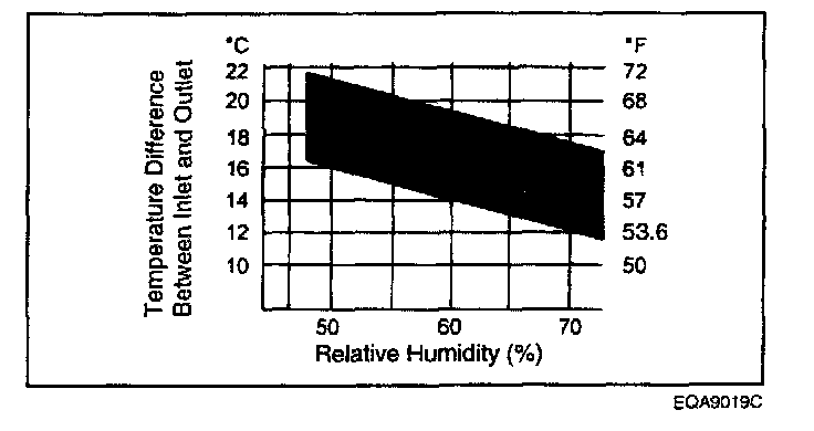 10. Check that the intersection of the relative humidity and temperature difference falls within the block. If the intersection is within the block, cooling performance is satisfactory.