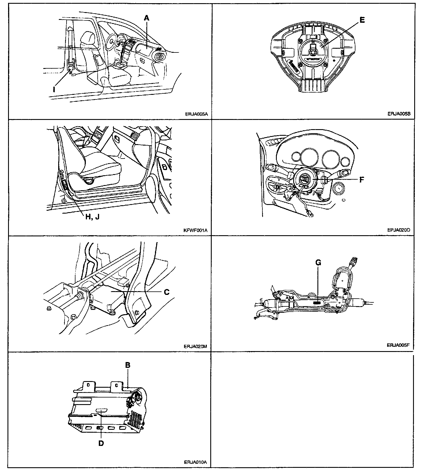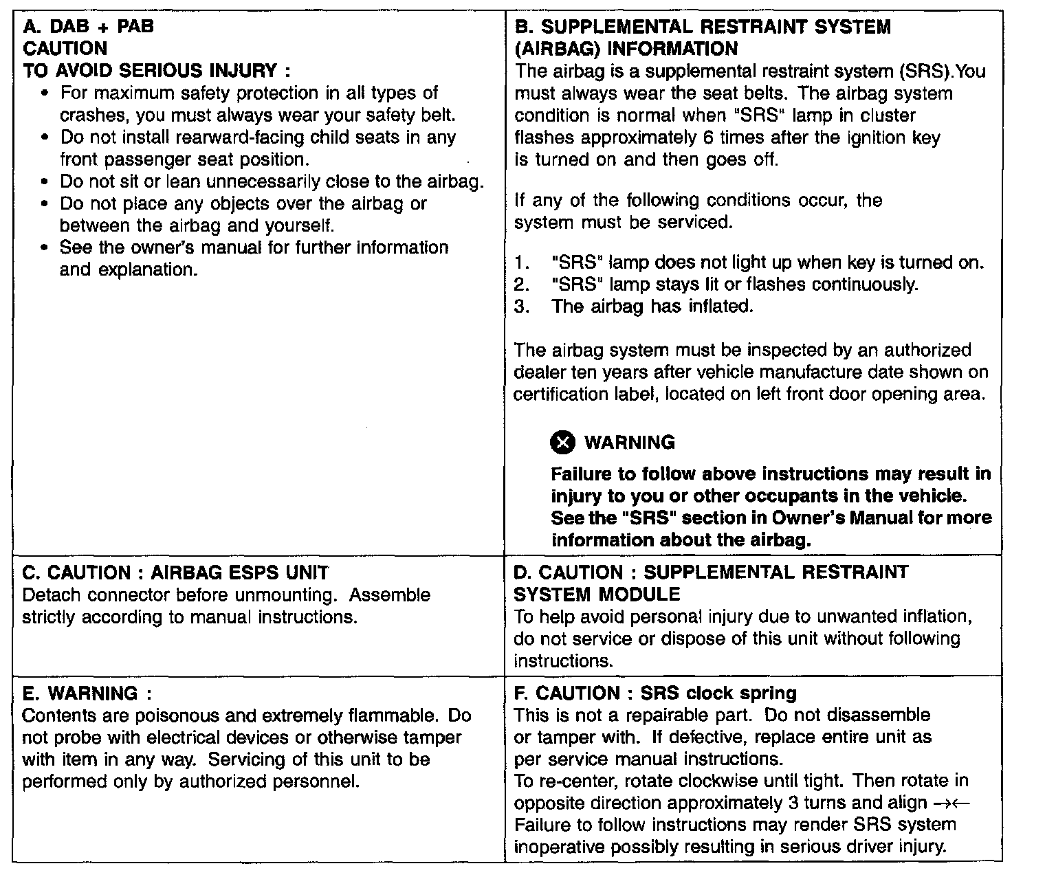 A number of caution labels relating to the SRS are found in the vehicle, as shown in the illustration. Follow the label instructions when servicing the SRS.