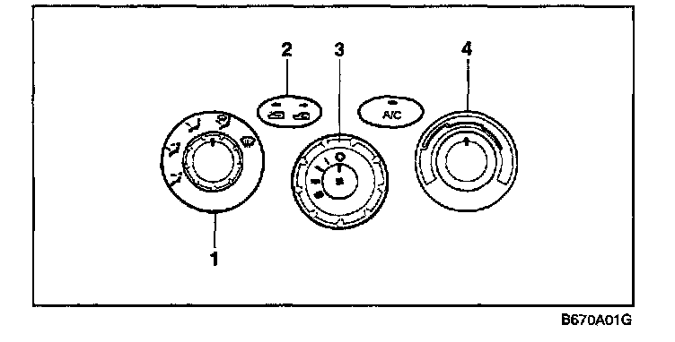 This is used to direct the flow of air. Air can be directed to the floor, dashboard outlets, or windshield. Five symbols are used to represent Face, Bi-Level, Floor, Floor-Defrost and Defrost air positions.