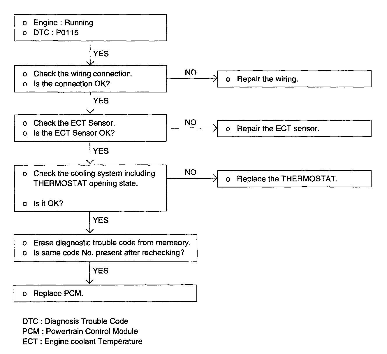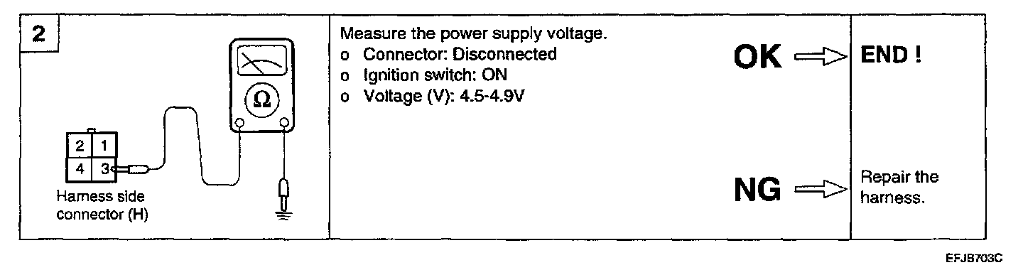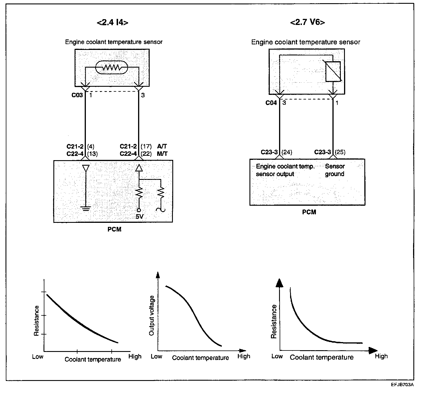 The engine coolant temperature sensor installed in the engine coolant passage of the cylinder head detects the engine coolant temperature and emits signals to the PCM. This part employs a thermistor which is sensitive to changes in temperature. The electric resistance of the thermistor decreases in response to a temperature rise (NTC). The PCM determines engine coolant temperature by the sensor output voltage and provides optimum fuel enrichment when the engine is cold.