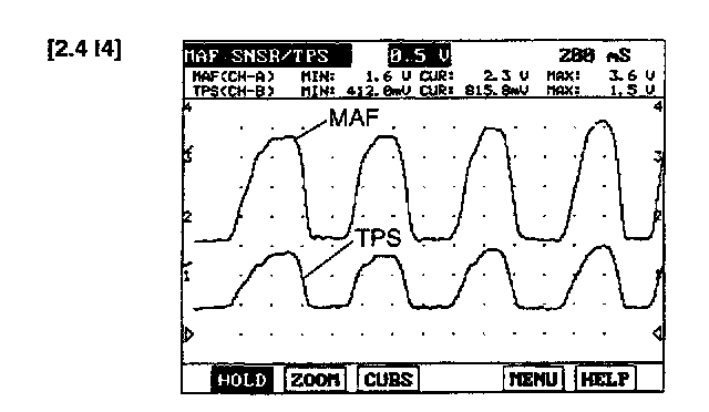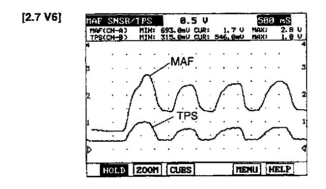 MAJOR SENSOR REFERENCE WAVE-FORMSThe followings are the major sensor reference wave-forms. Below is the data for Mass Air Flow Sensor, Throttle Position Sensor when revving quickly up to 4800 rpm under no load after warming up engine sufficiently. Each value is for reference, the exact values may vary.