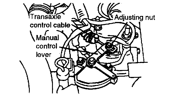 6. Gently pull the transaxle control cable in the direction of the arrow, then tighten the adjusting nut.