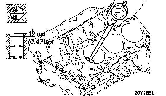2. Measure the cylinder bore with a cylinder gauge at the three levels indicated, in the directions A and B.