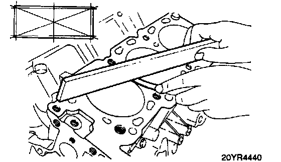 8. Check the top surface of the cylinder block for flatness. If the top surface exceeds the limit, grind to the minimum limit or replace.