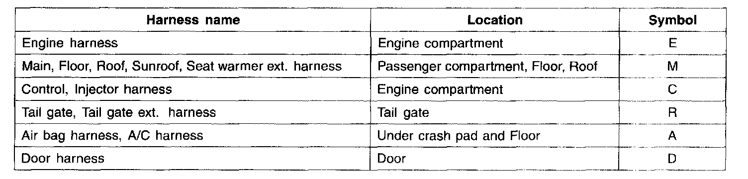 Electrical wiring connectors are classified according to the wiring parts in the Harness Layouts.