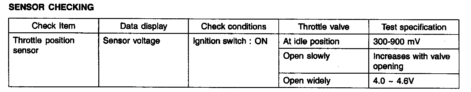 THROTTLE POSITION SENSOR (TPS)The TPS is a variable resistor type that rotates with the throttle body throttle shaft to sense the throttle valve angle. As the throttle shaft rotates, the output voltage of the TPS changes. The ECM detects the throttle valve opening based on voltage change.