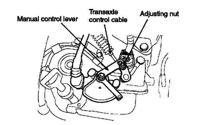6. Gently pull the transaxle control cable in the direction of the arrow, then tighten the adjusting nut.