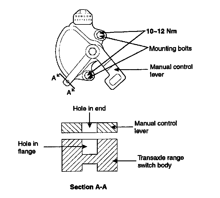 4. Loosen the transaxle range switch body mounting bolts and then turn the transaxle range switch body so the hole in the end of the manual control lever and the hole (cross section A-A in the figure) in the flange of the transaxle range switch body flange are aligned.