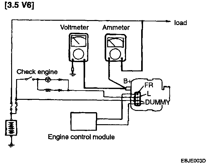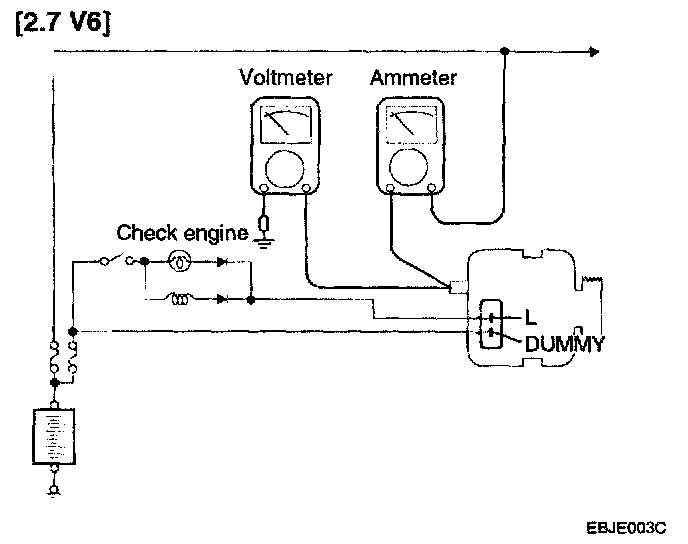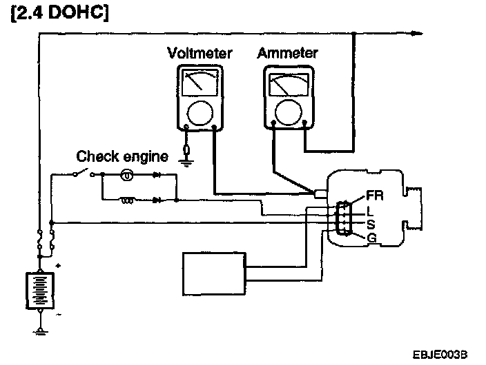 1. Check to see that the voltmeter reads as the same value as the battery voltage. If the voltmeter reads 0 V, and the open circuit in the wire between the generator "B" terminal and battery (-) terminal, a blown fusible link or poor grounding is suspected.