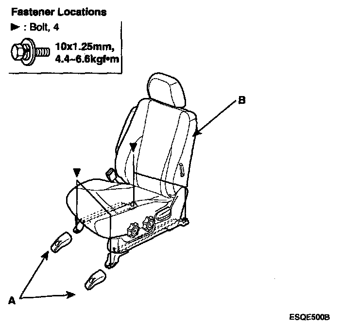 2. After loosening the seat assembly mounting bolt and nut, remove the seat assembly (B).