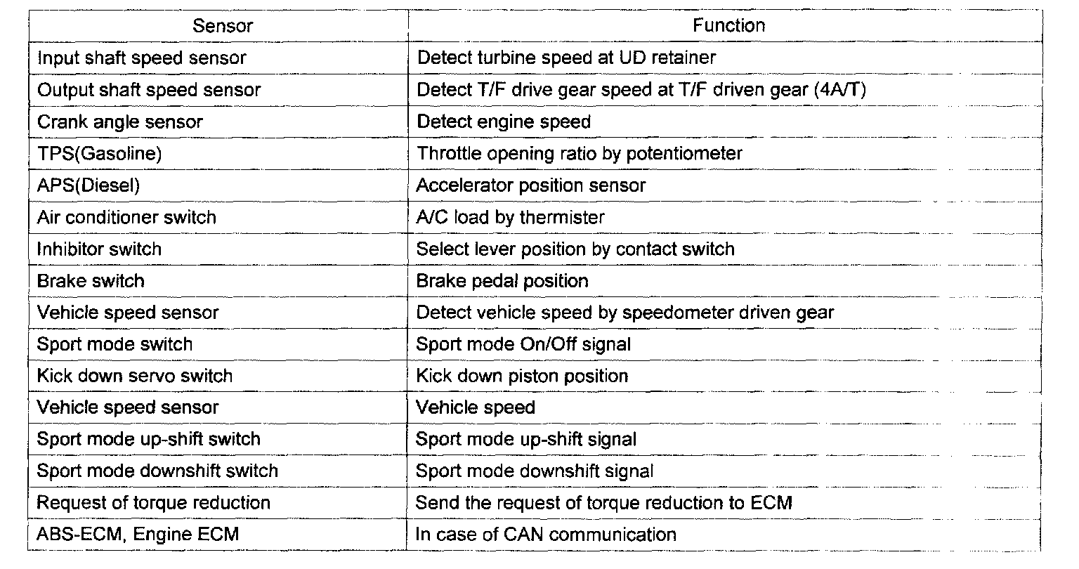 The Lock-up clutch is designed in a torque converter for the fuel economy. The lock-up clutch works in low speed range as minor slip. And it operates in high speed range as Full lock-up. Low fuel consumption and silence can be obtained with combination of Partial lock-up and Full lock-up control. The damper clutch is operated in 3rd and 4th gear in 4-speed ATA, 4th and 5th gear in 5ATA. In addition, Lock-up control is adapted in order to improve the fuel economy, when reducing vehicle speed too.