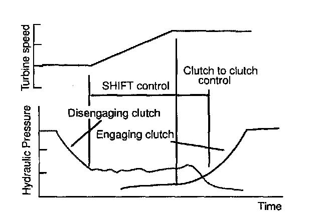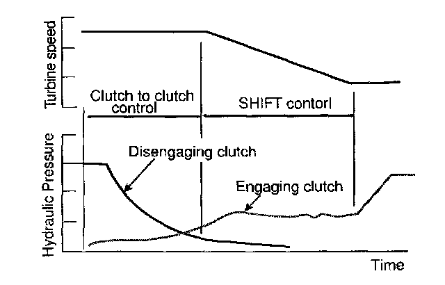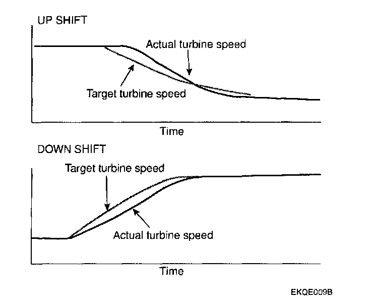 The turbine speed is monitored and controlled during shifting to satisfy target turbine speed which is accomplished by feedback control of solenoid valve duty value. Therefore the compensation of torque for the outworn engine or A/T is possible. This has resulted in the ability to control the change in torque during shifting and produce smooth shift and better shift feeling. Feedback shift control is also applicable in N -> D and N -> R.