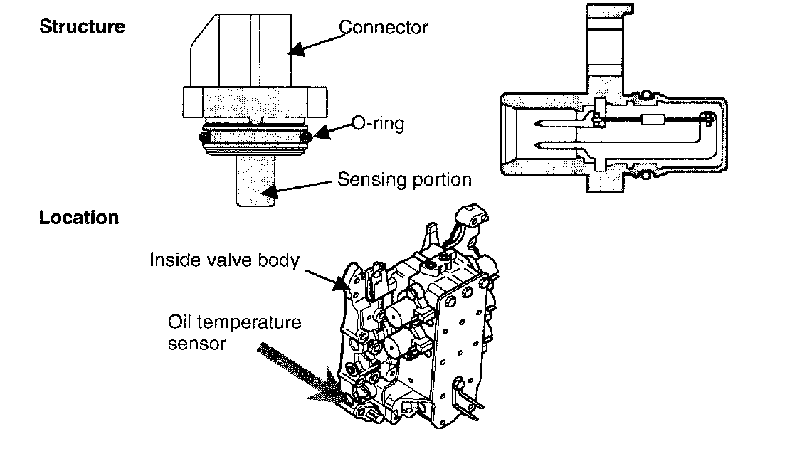 The oil temperature sensor is of the thermistor type, and senses the automatic transaxle fluid temperature. Using the signal from this sensor, TCM controls the shift pattern optimally during shift. In order to operate the damper clutch, this signal is also referred.