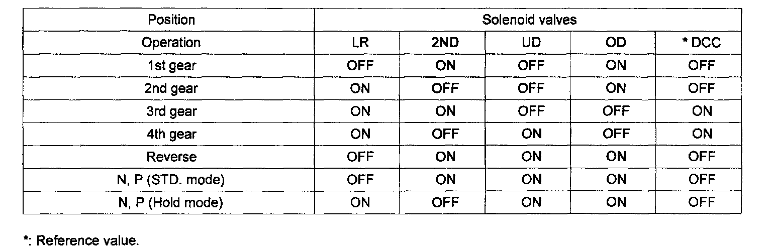 Solenoid valve ON: Hydraulic pressure is released from corresponding clutch or brake.