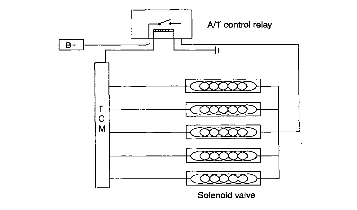 As soon as the A/T control relay is ON, the battery voltage is directly supplied to solenoid valves and each solenoid valve is operated when the TCM grounds the opposite terminal. (-) Control At fail safe condition, the power is cut causing 3 gear hold.