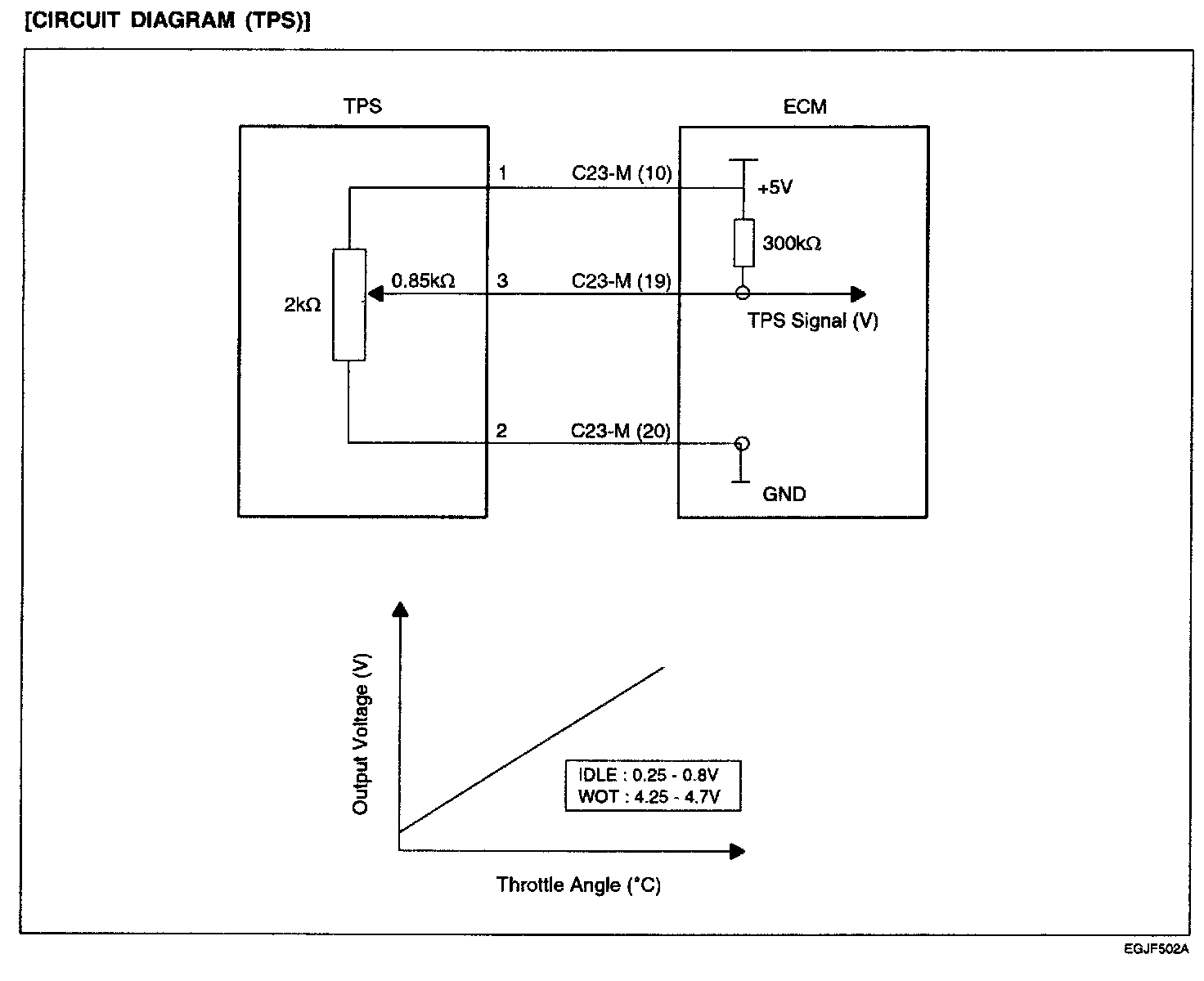 The TPS is a variable resistor type that rotates with the throttle body throttle shaft to sense the throttle valve angle. As the throttle shaft rotates, the output voltage of the TPS changes. The ECM detects the throttle valve opening based on voltage change.