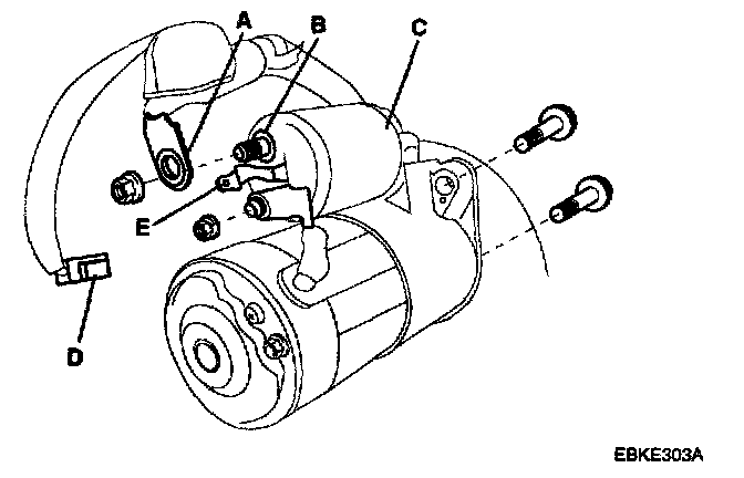 2. Disconnect the starter cable(A) from the B terminal(B) on the solenoid(C), then disconnect the connector(D) from the S terminal(E).