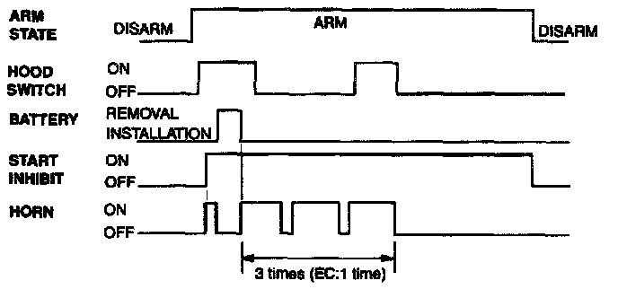 This system enters the armed state if it is in the prearmed state and,after 0.6 sec, check actuator lock and each door, hood and tailgate close,and no door warning switch (no key in ignition).