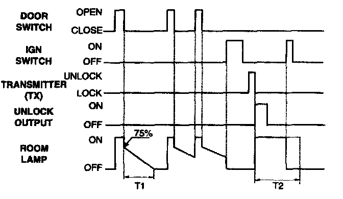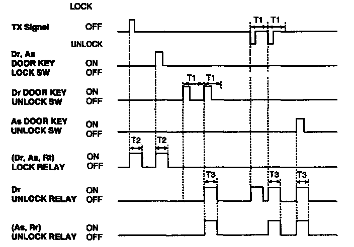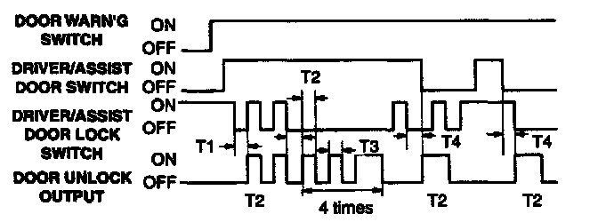 - When the driver's door key UNLOCK switch is ON during T1 after the transmitter's UNLOCK signal is detected, the 4 door UNLOCK relay is ON for T3.